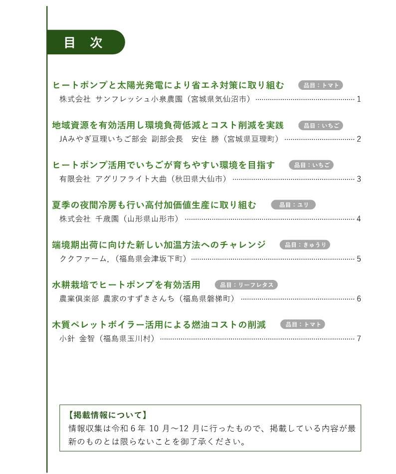 ヒートポンプ等と燃油暖房機を併用する「ハイブリッド型園芸施設等」の導入の加速化を図ることを目的に、東北各地でハイブリッド型園芸施設等を導入している方々の事例を取りまとめました。ヒートポンプ等を使用した環境負荷低減の取組を行う際、ご参考の上、是非ご活用ください。