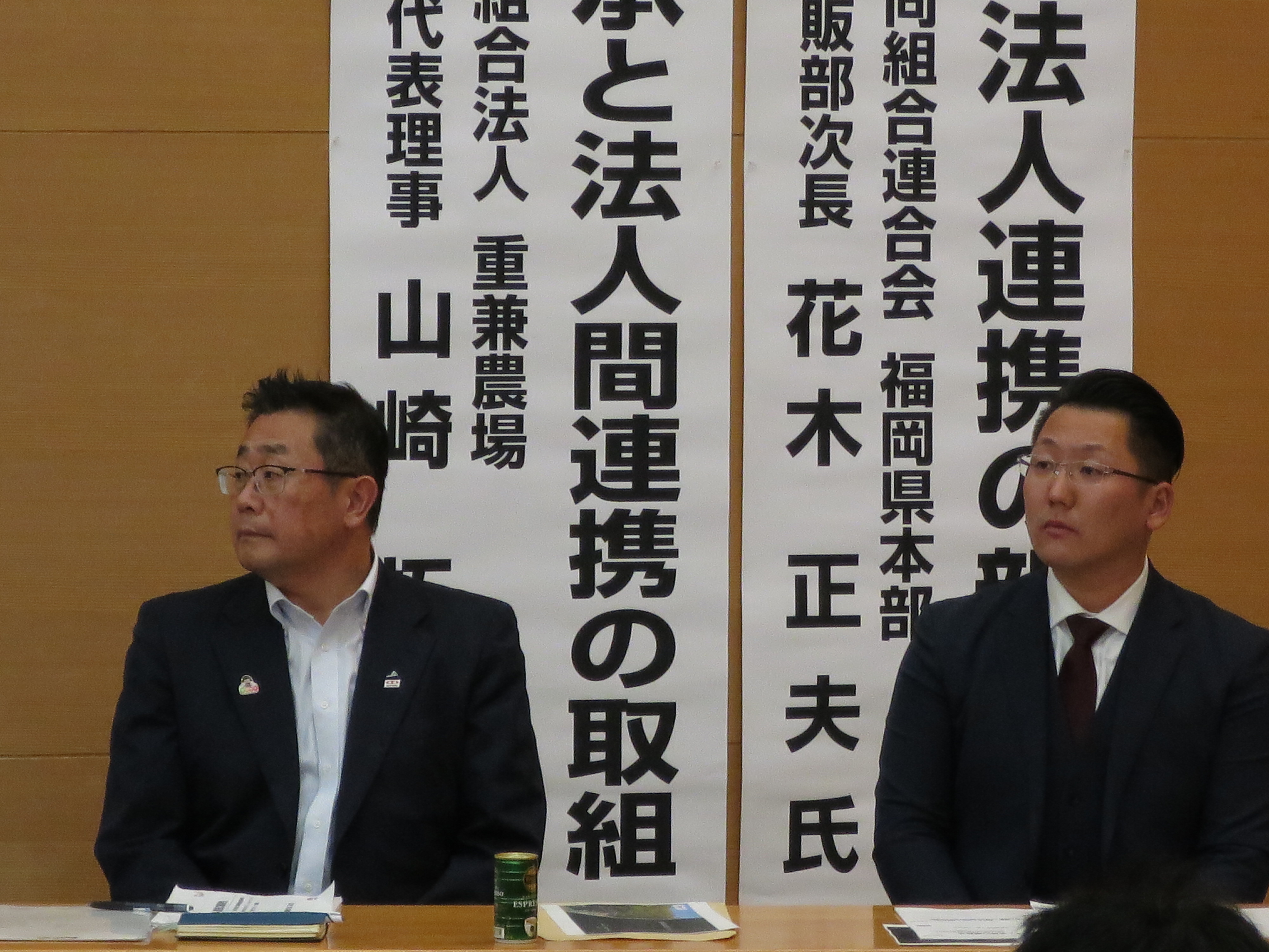 | 出席された方々と記念撮影 | (左から)株式会社そば研の渡部さん、 藤原代表 |