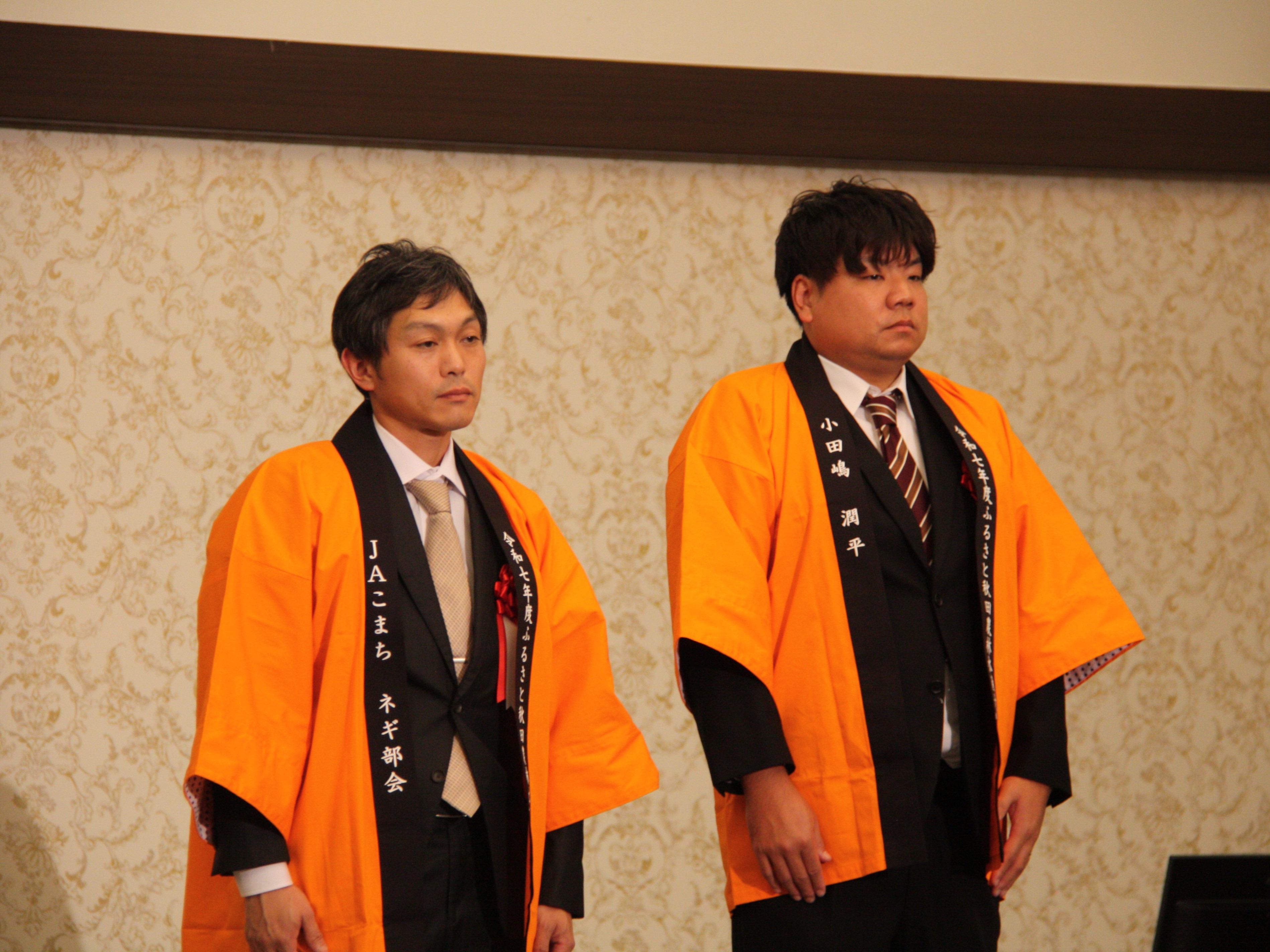 農林水産大臣賞を受賞した 「JAこまちネギ部会」(左) と「小田嶋潤平さん」(右) |