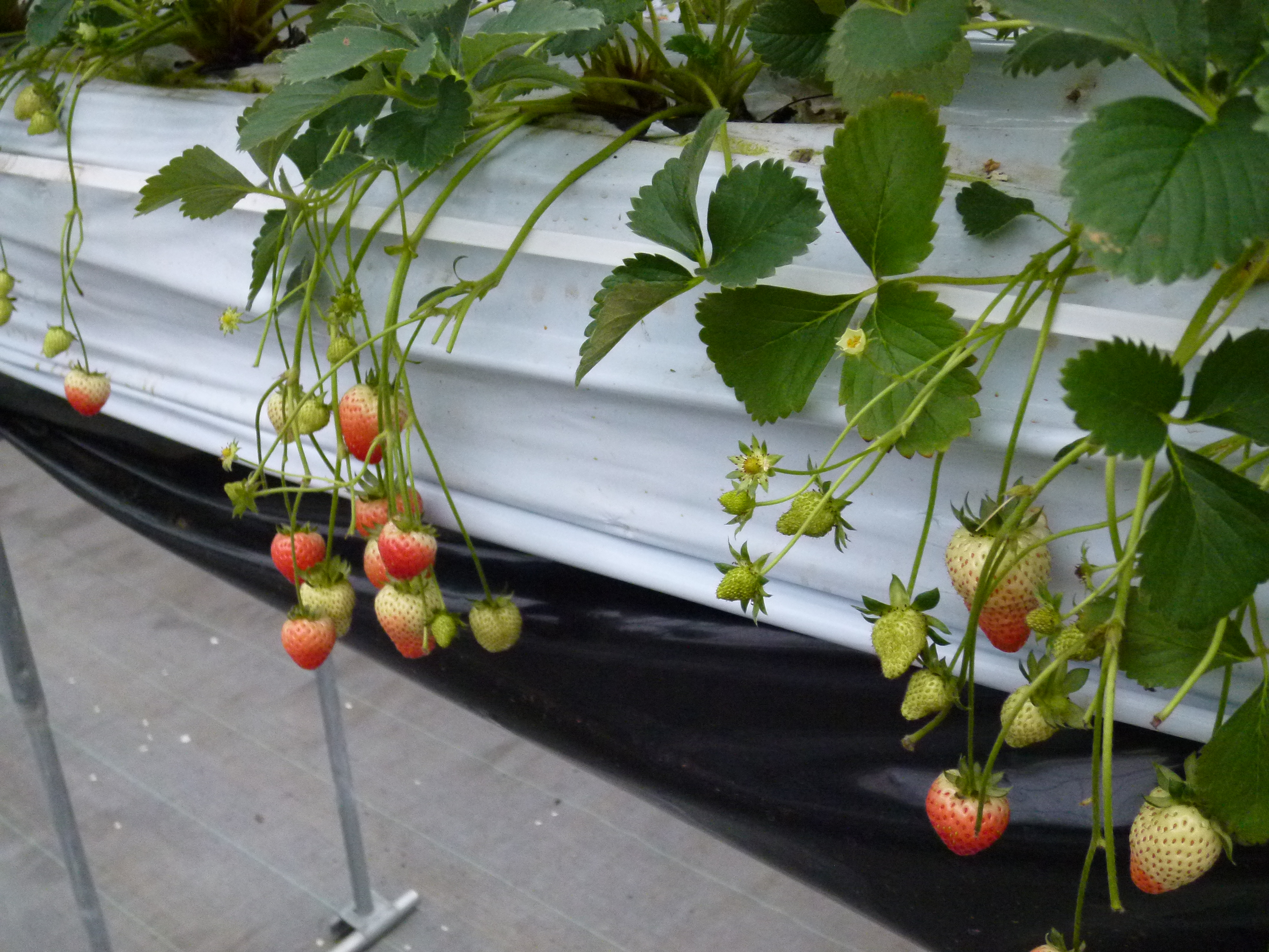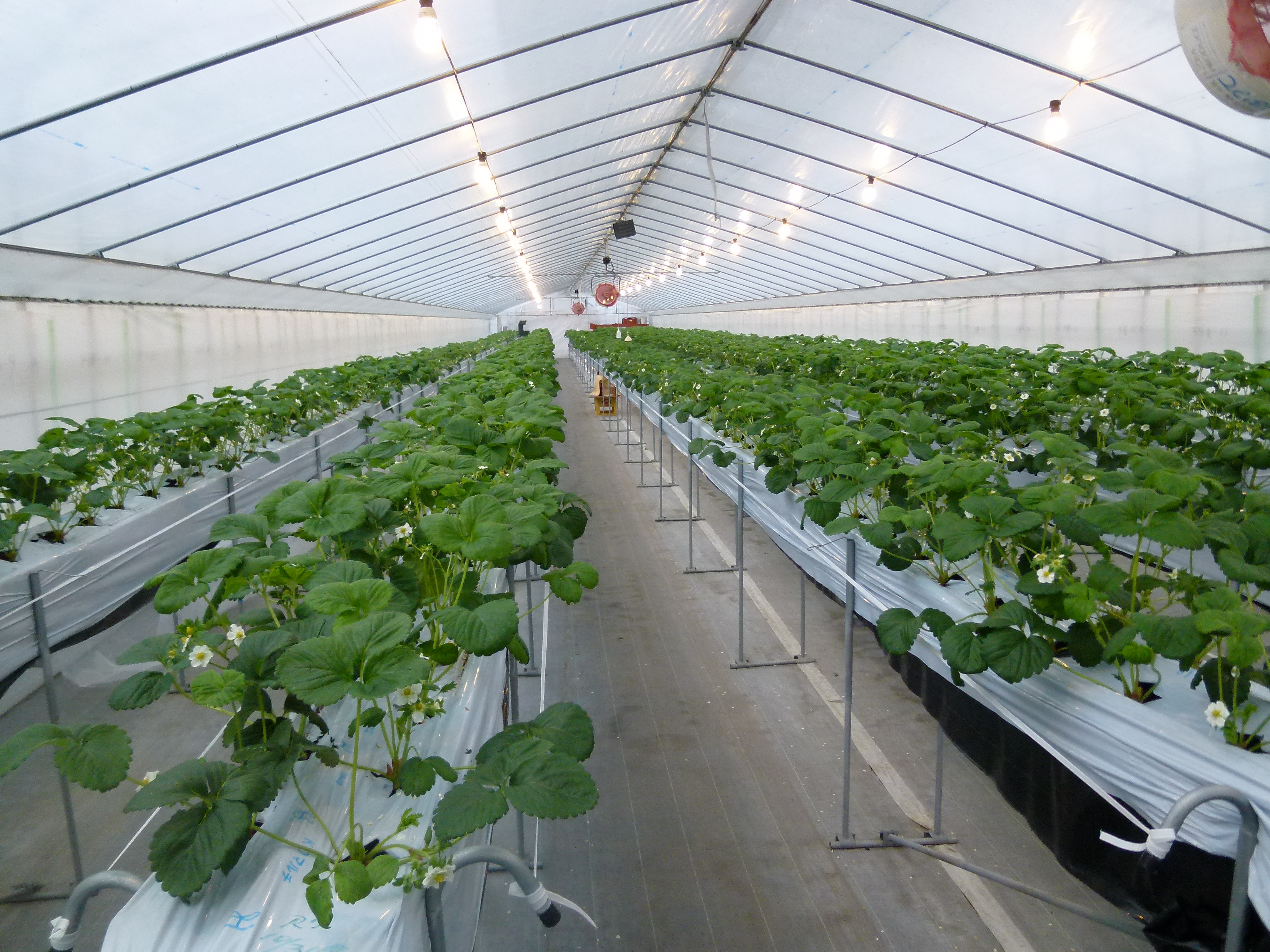 農事組合法人アグリフォー太田では、ハウスでいちごの水耕栽培に取り組んでいます。小松一男代表理事からは、「従業員の冬期間の雇用を確保するため8年前からいちご栽培を始めた。今年から夏いちごに取り組んだことで、今まで以上に作業の切れ目がなくなり安定した周年雇用に結び付いている。」と話がありました。また、いちご担当の高橋さんは「将来、オリジナルの品種を作り、地場産いちごのブランドとして広めることが目標。」と意気込みを話してくださいました。