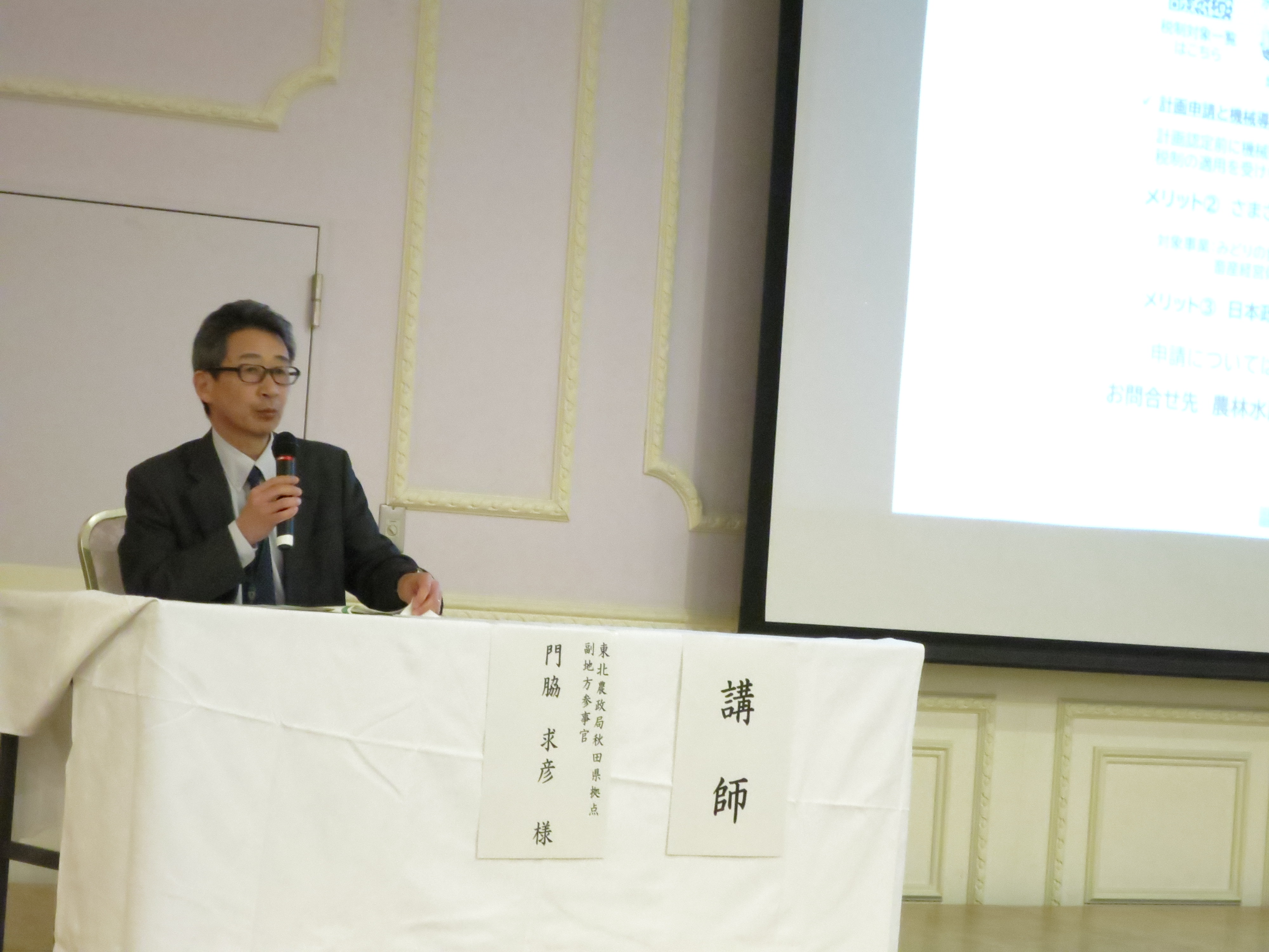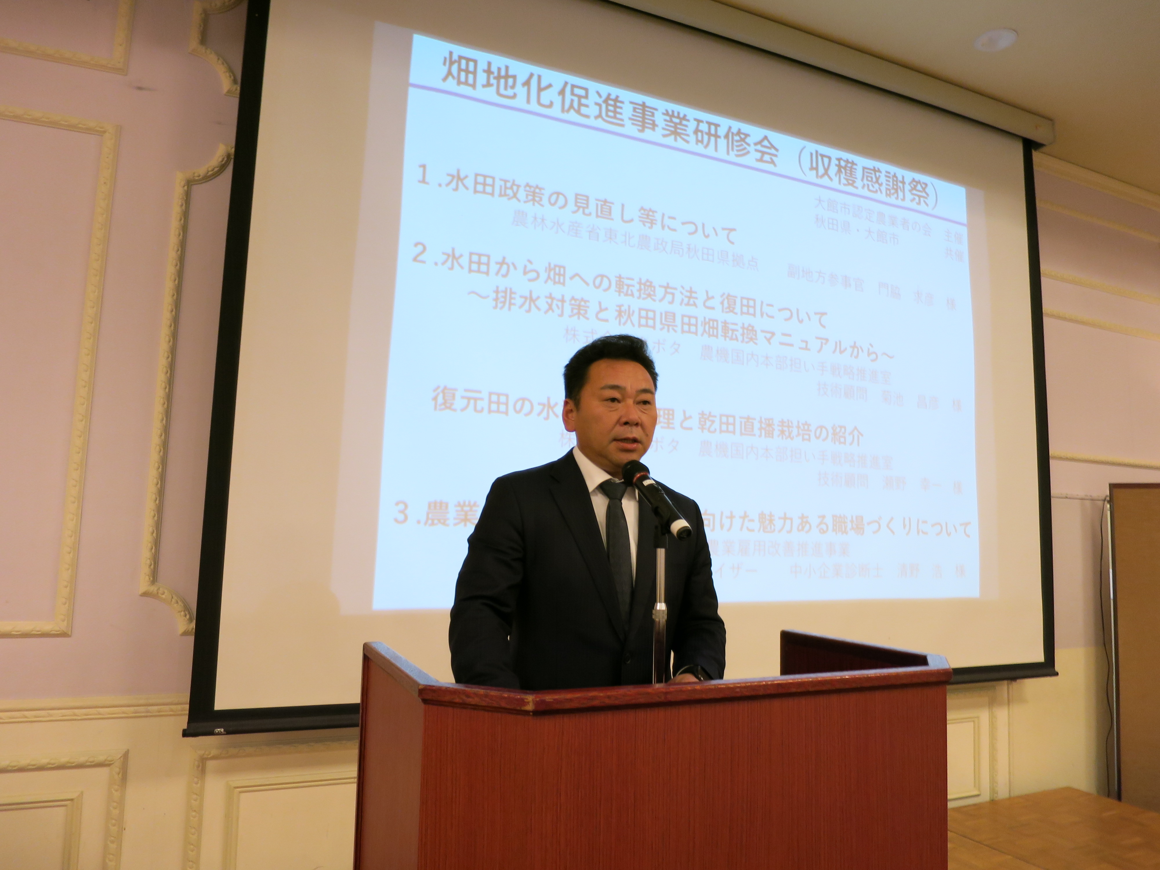 秋田県大館市認定農業者の会主催の畑地化促進事業研修会が大館市ルネッサンスガーデンプラザ杉の子で開催されました。