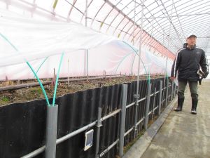 高設溶液栽培中の苗「恋みのり」、 室内は23℃前後に保たれている |