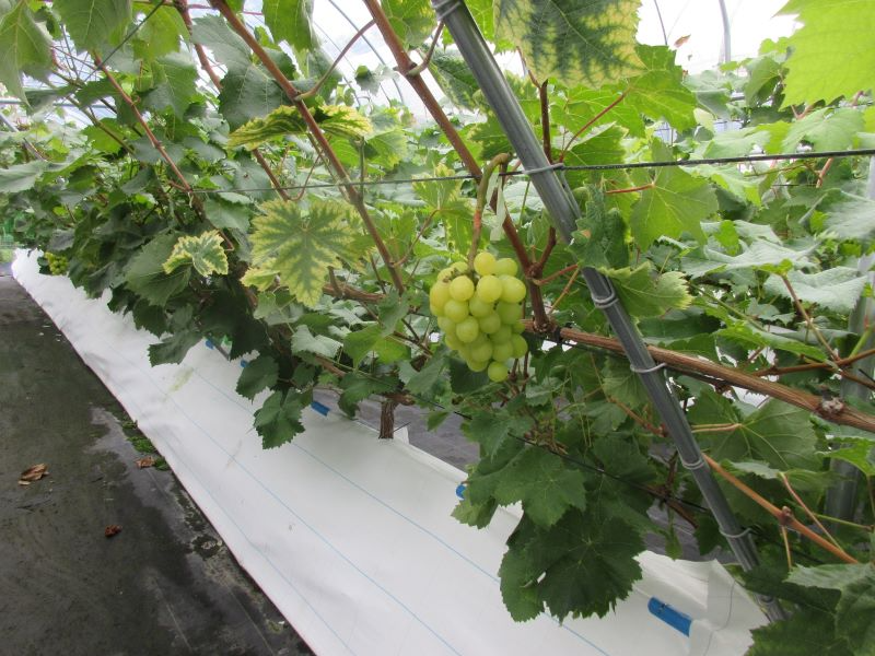 | 赤く色づいて収穫期を迎えた露茜 | 実の大きさが50~70グラムと大粒となる露茜 |