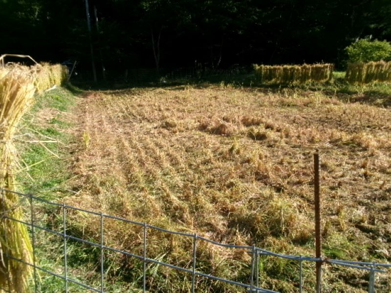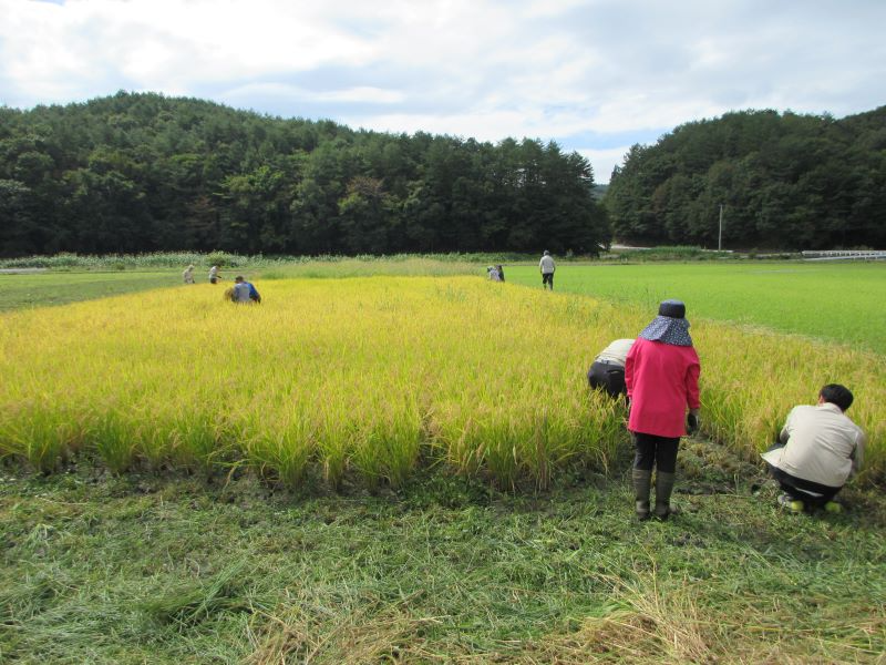 | 刈取り時期を迎えた水稲の実証栽培ほ場 | 手刈りで稲を刈取り作業 |