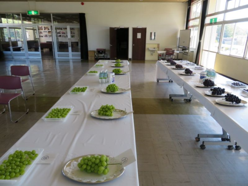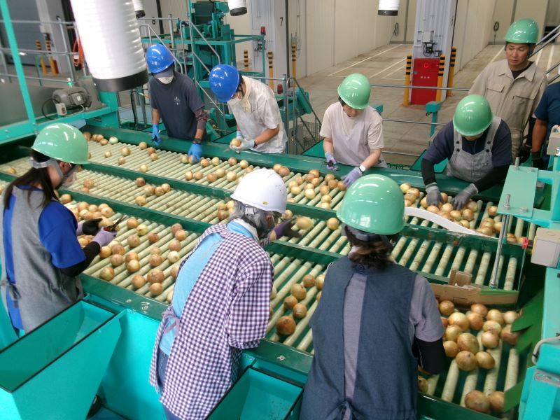| 選果作業 (同施設は稼働2年目。作業員は、慣れた 手さばきで変形、傷、腐敗果などを除去) |
