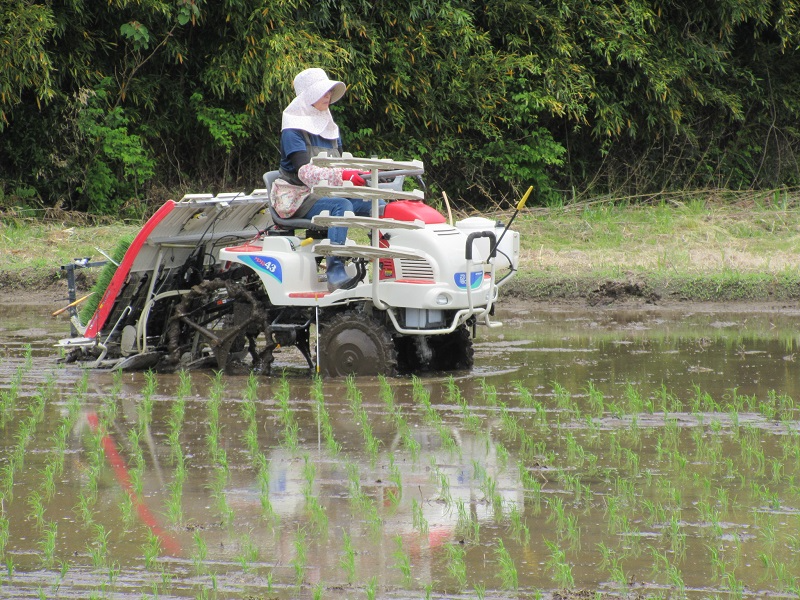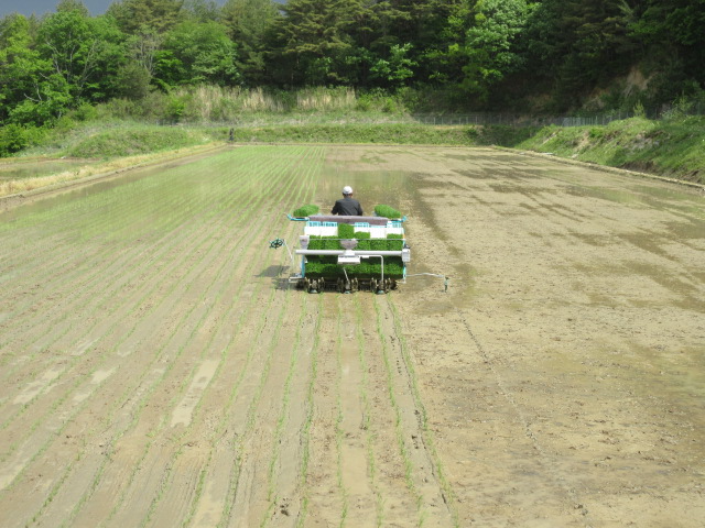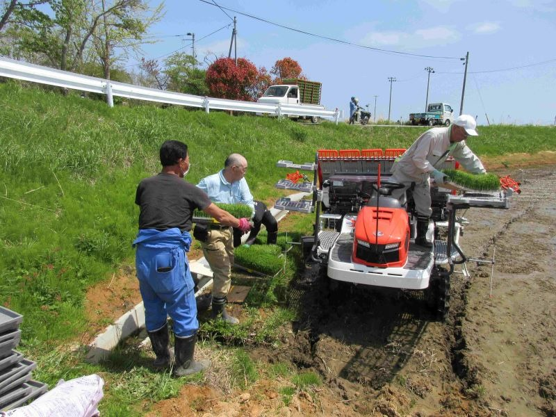 5月15日(木曜日)に浪江町室原地区において、今回で3回目となる水稲の試験栽培が始まり、室原復興組合の組合員によって田植え作業が行われました。
