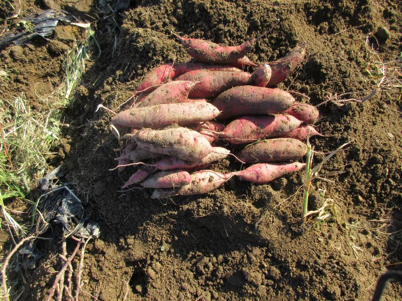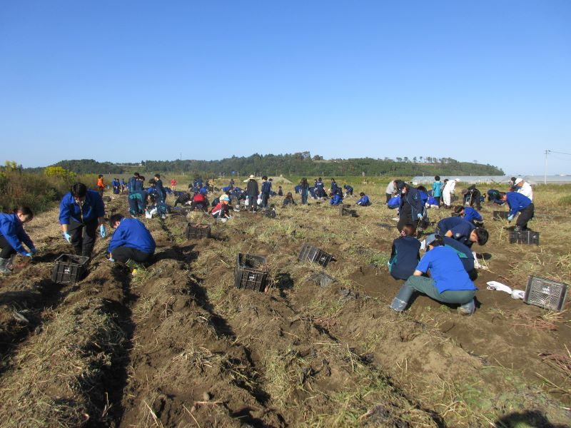 | 秋空の下で行われたサツマイモの収穫作業 |