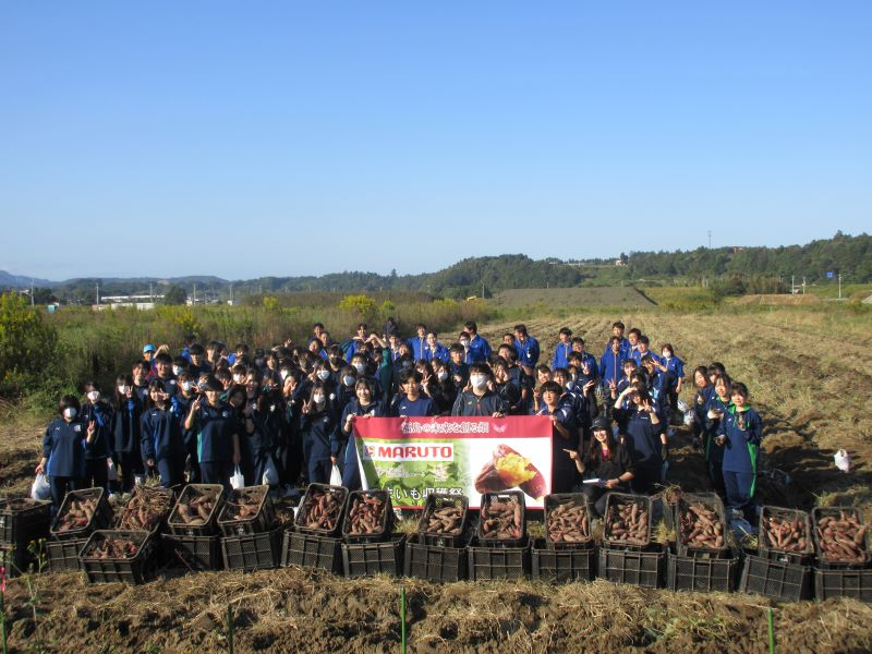令和7年10月15日(水曜日)、スーパーマーケットを運営する株式会社マルト(本社:いわき市)は、「楢葉町×マルト サツマイモプロジェクト」の収穫祭を開催しました。本プロジェクトは、楢葉町との協定により復興とサツマイモの振興を目的に取り組まれています。収穫祭には、高校生と関係者など約150名が参加し、5月に自らが苗植えをしたサツマイモの収穫を体験しました。今後、参加した高校生が収穫したサツマイモを使用してスイーツなどの商品開発が行われ、同社店舗で販売されることになっています。