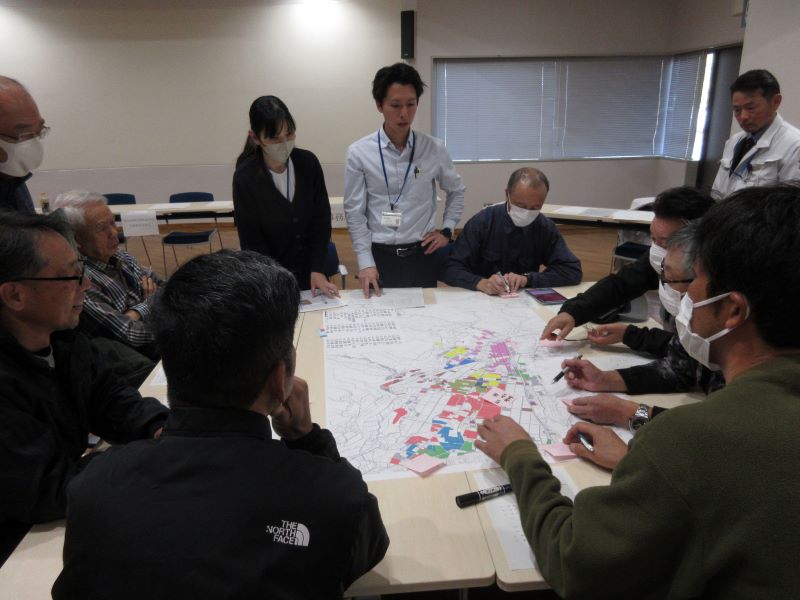 計画策定地区別の協議 目標地図を前に営農されていない農地の担い手などを協議する参加者 |