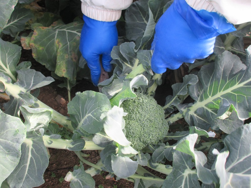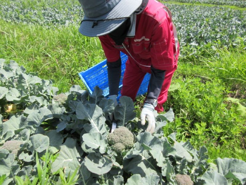 ブロッコリーの収穫作業 (同社の黒津今日子さんが手作業で収穫を行っています。また、ほ場では2名の農業支援員も一緒になって収穫から出荷までの作業を支援しています。) |