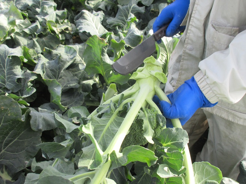 | 一株ずつ花蕾の大きさ(15センチ~20センチ目安)を確認し手作業で収穫されます。 | 収穫したブロッコリーは、その場で余分な茎葉も切り落とされます。 |