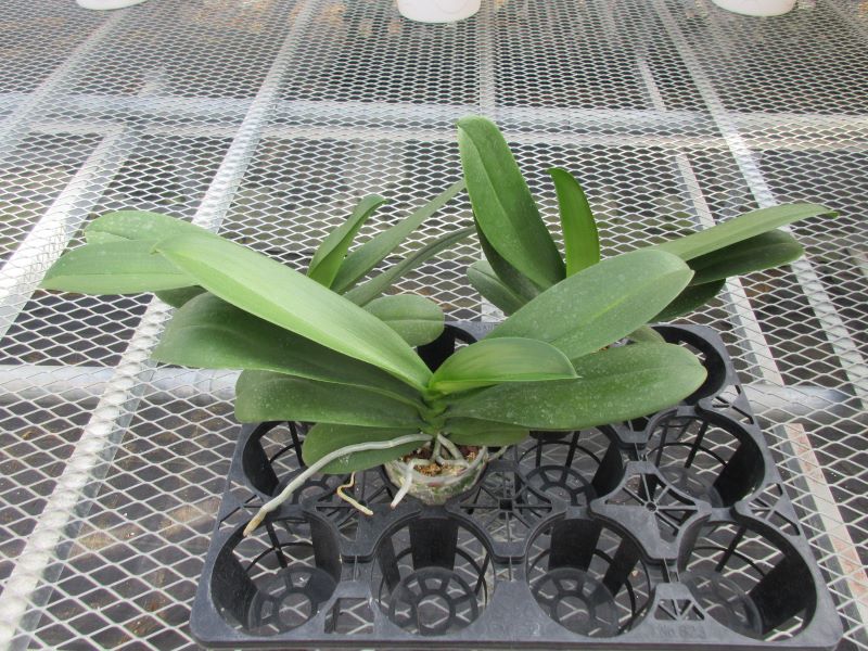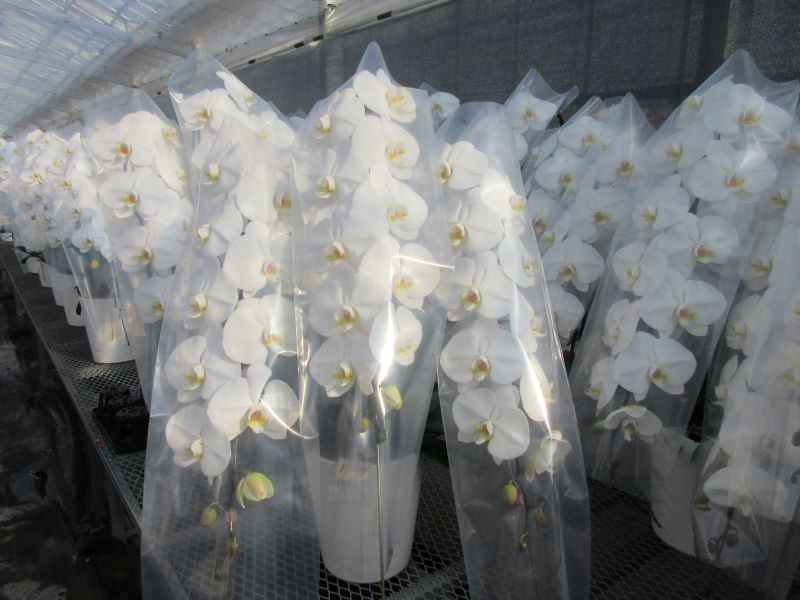 | 入荷後約2週間経過した苗で、約6か月後に出荷となります。 | 花を傷つけないため胡蝶蘭専用のシートで1本1本 カバーされています。 |