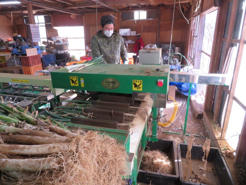 | 機械による根葉切り、皮むき作業 機械は「原子力被災12市町村農業者支援事業」を活用し、今年度から新たに導入 |
