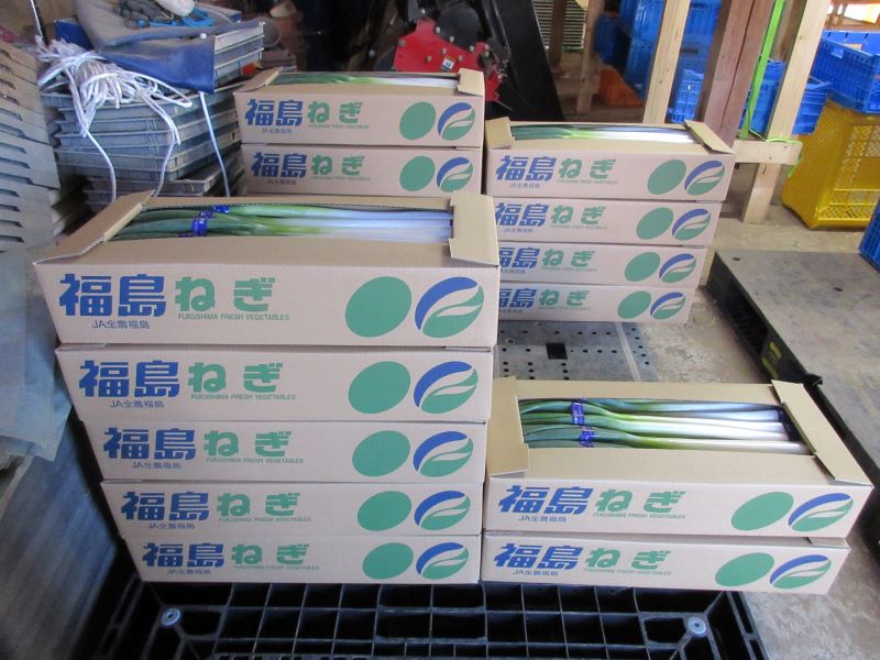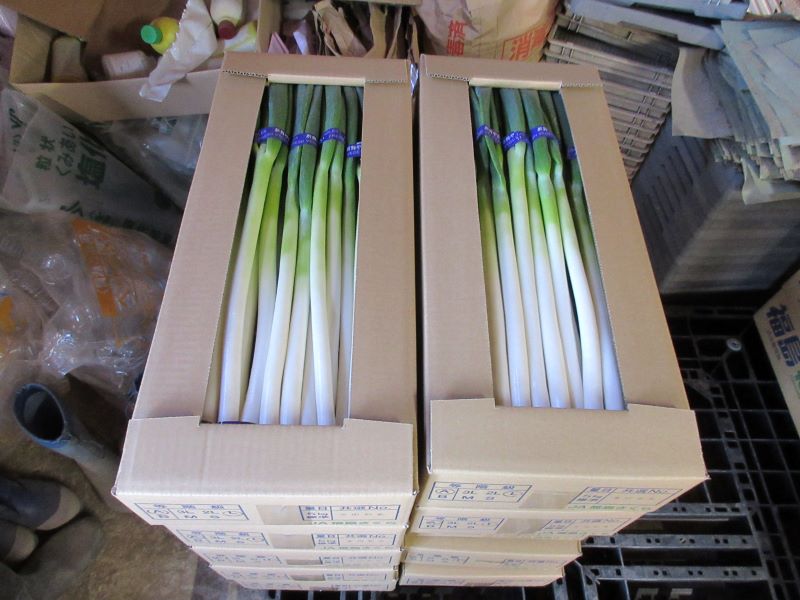 | 市場出荷向けに選別・梱包された長ねぎ | サイズ別に区分された市場出荷箱 |