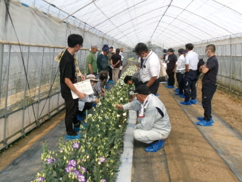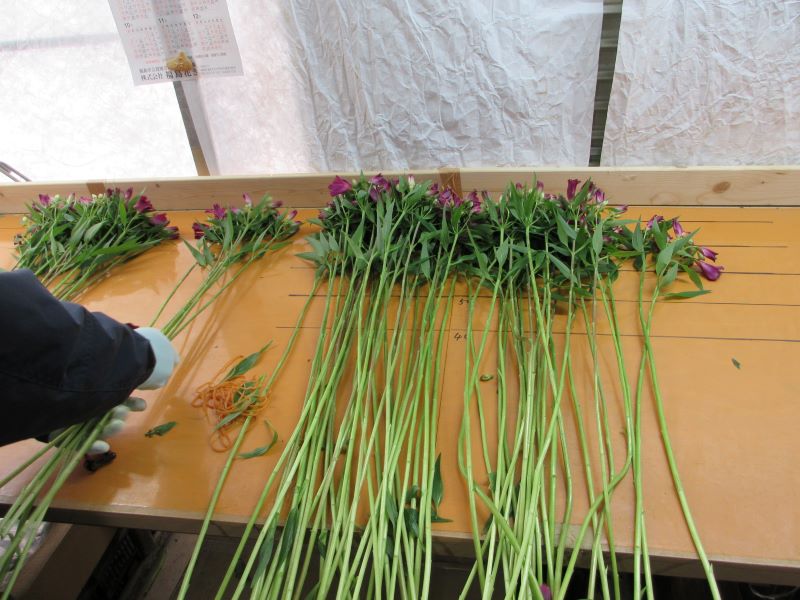 | 選別作業 収穫した花を選別し、長さをそろえて束ねます。 |