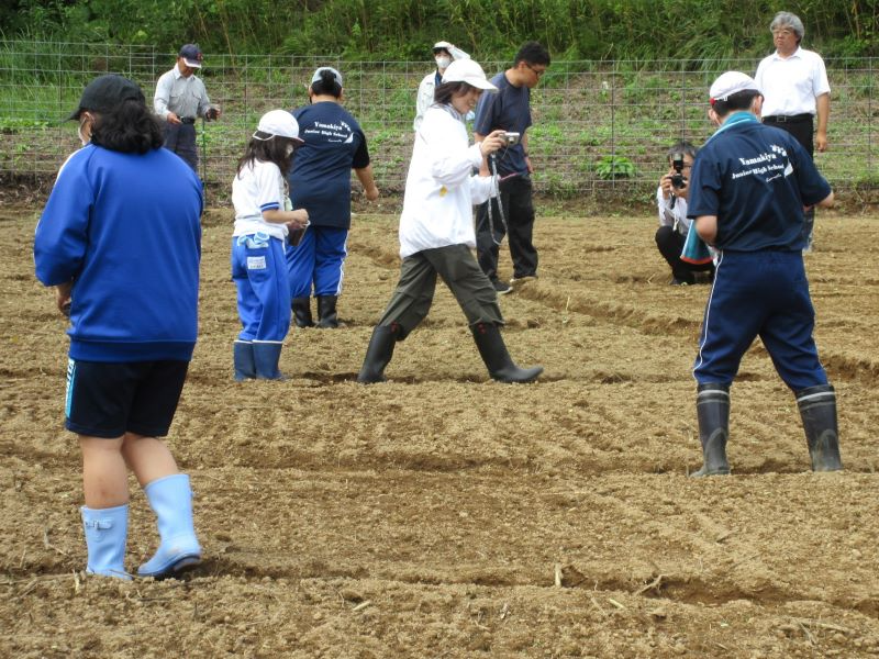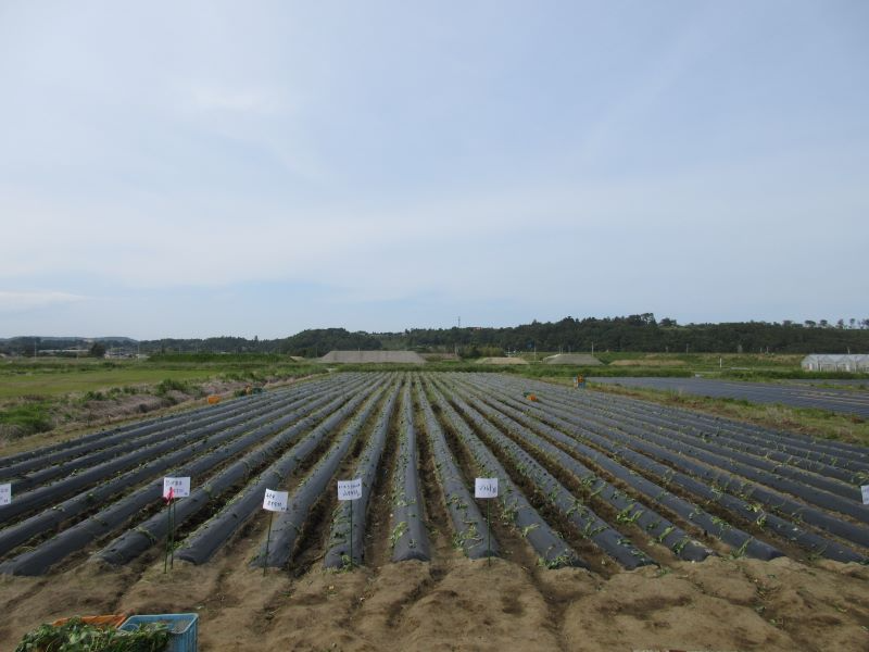 | ほ場の提供を受ける株式会社福島しろはとファーム(本社:楢葉町)の社員から指導を受け、苗植えを行う高校生 | 苗植えを終えたさつまいも畑 (高校生が収穫したさつまいもを使用し、開発された商品は、来年1月以降に同スーパーの店舗で販売されることになっています。) |