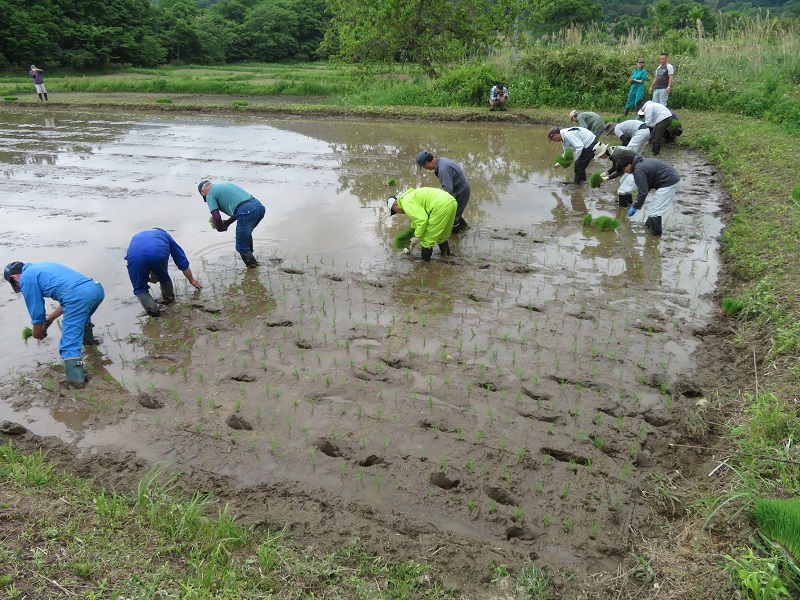 5月24日(土曜日)に浪江町津島地区において、今回で2回目となる水稲の試験栽培が始まり、津島復興組合の組合員によって、手植えによる田植え作業が行われました。