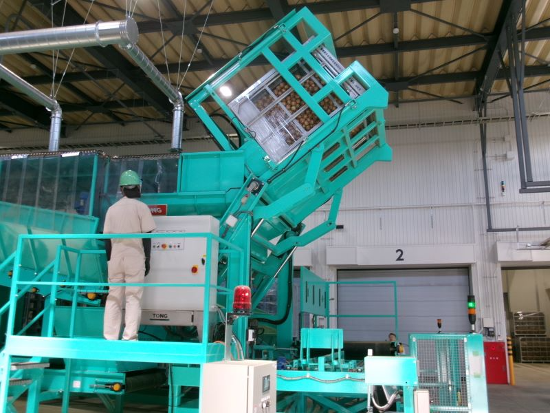 たまねぎを選果ラインへ投入 (乾燥室(画面奥)で乾燥を終えたたまねぎ約1トンが入る鉄コンテナを反転) |
