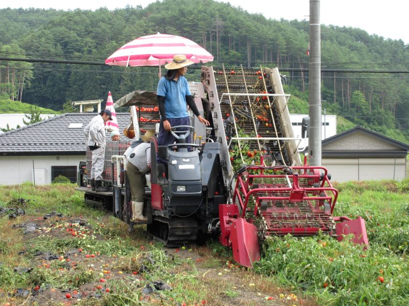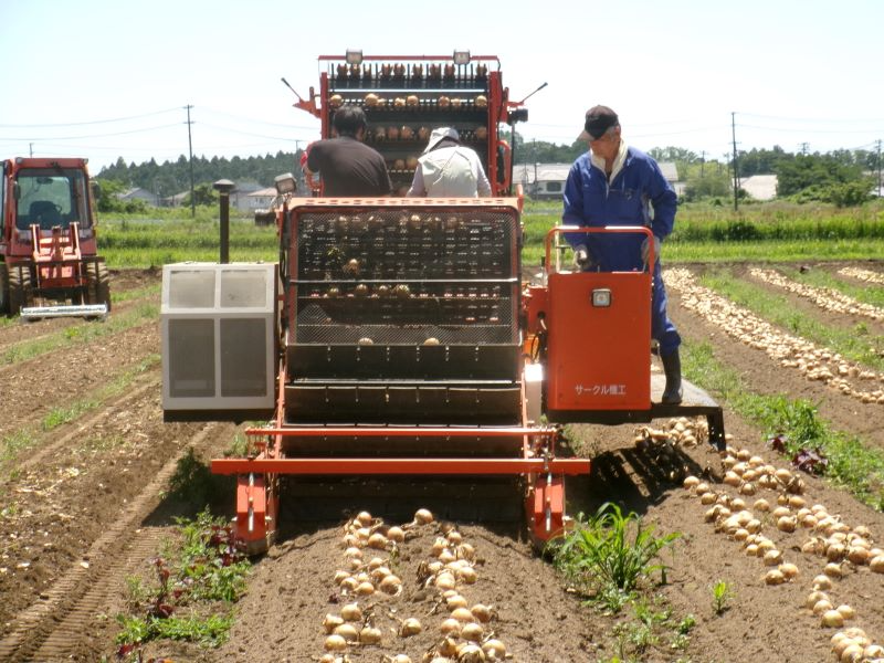 | ロボットパレダイザ―による製品のパレット積み | たまねぎの収穫作業(富岡町内) |