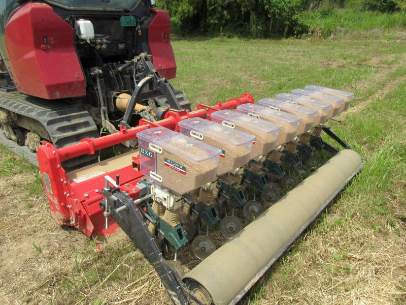 節水型水稲栽培ほ場で播種作業するため 播種機をセット |