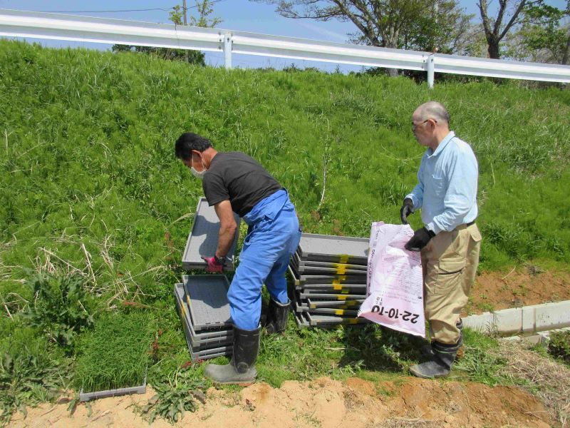 肥料を運ぶ作業応援者は「ゴールデンウイークは、 休工現場が多く警備業務が減少するため、農作業の 応援時間が確保しやすい」と話されていました。 |