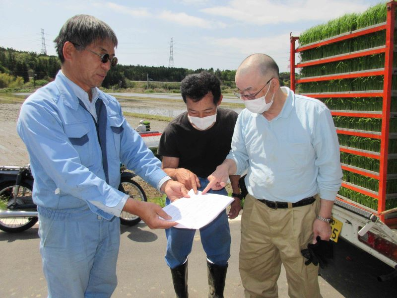 令和7年5月1日(木曜日)、富岡町で水稲(約7ヘクタール)を栽培する猪狩秀信さんは、(株)コスモさくら警備保障(本社:富岡町)と締結した「農作業応援に関する協定」に基づき、初めて社員2名から田植え作業の応援を受けました。同協定は、同社が社員の兼業を認めて、猪狩さんが、直接定額で農作業を依頼するものです。猪狩さんは、田植え作業(5日間)を同社社員へ延べ10名依頼しており、今後も畦の草刈り作業等に協定を活用することにしています。
