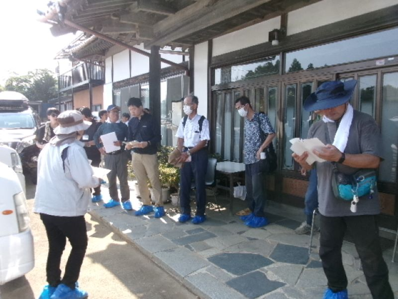 | 猪狩さん(左)から作業内容や危険防止に 関する注意事項の説明を受ける作業応援者 |