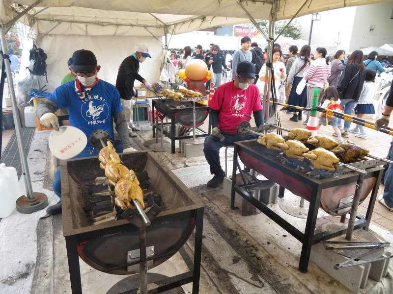 | 炭火による川俣シャモの丸焼き | 川俣シャモを使った料理の販売ブース |