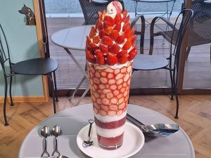 今年から提供している特大パフェ (全高約55センチメートル 重量約5キログラム) (画像提供:まるなかファーム) |