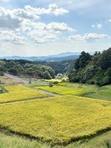 | 黄金色に輝く稲穂 遠方には阿武隈高地 |