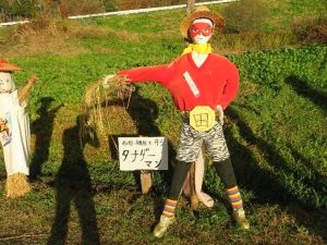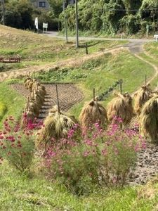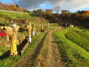 現在は稲刈りを終え、11月下旬まで「かかし祭り」が開催中です。約30体の個性豊かな案山子(かかし)が並び、訪れる人々を楽しませています。