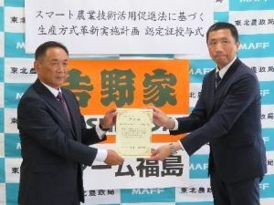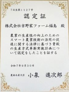 2025年10月7日、白河市表郷公民館において、株式会社吉野家ファーム福島に対し「スマート農業技術活用促進法」に基づく生産方式革新実施計画の認定証を授与しました。