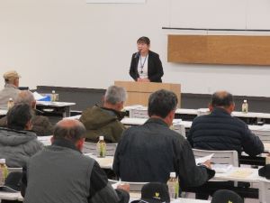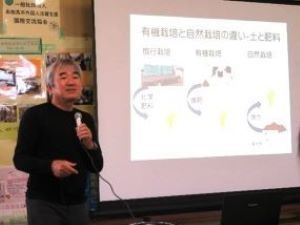 また、弘前大学農学生命科学部 杉山修一名誉教授からは「日本農業の現状と自然栽培の可能性」をテーマに講演があり、自然栽培は、慣行栽培と比べ単収は減少するものの資材費等のコストが低減できること、慣行栽培品に比べ高く価格を設定しても十分に販売できること等の説明がありました。課題として、自然栽培は、まだまだ技術は発展途上であり、今後は、技術を指導する人材や教材が必要とのお話がありました。