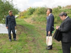 | 意見交換の様子 | 果樹栽培を行っている斎藤 潤さん | 福島市飯坂町の圃場 |