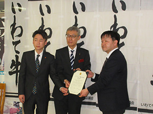 岩手県内のJAや食肉処理施設、流通業者などでつくる、「いわて農林水産物国際流通促進協議会 牛肉輸出拡大コンソーシアム」がフラッグシップ輸出産地に認定され、東北農政局の阿部輸出対策推進官から同協議会の佐藤法之会長(県農林水産部長)とコンソーシアムの和山修会長((株)いわちく商品部長)に、認定証を授与しました。