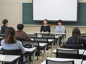 滝沢市に所在する盛岡大学を訪問し、栄養科学部栄養科学科の新3・4年生17名を対象に、東北農政局の業務内容について説明しました。当日は若手職員2名が、入省のきっかけやこれまで経験した業務内容、ワークライフバランス等の体験談を基にフリートークを行いました。フリートークでは、学生の皆さんから就職活動の進め方や入省後の異動、残業の状況等について多くの質問をいただきました。また、「農林水産省のイメージが変わり、進路選択の幅が広がった」「具体的な仕事内容に加え、育児休業や通勤に関する話が聞けて参考になった」などの感想も寄せられ、東北農政局の業務や働き方について理解を深めていただく機会となりました。
