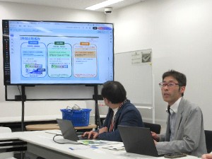 県内における農産物の環境負荷低減の取組の「見える化」の事例のほか、農林水産分野におけるカーボン・クレジットの推進等の説明に、学生から「現在のみどり戦略の達成状況はどのくらいか」「大学に期待することは」などの質問がありました。