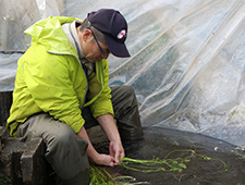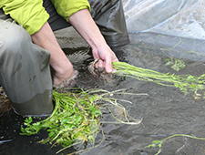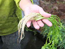 根に付いた泥を湧水で洗う佐藤さん