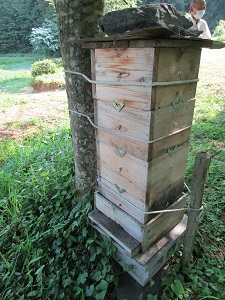 畑に隣接した山林にニホンミツバチが生息していたことから、巣箱を設置してみたところ、うまくミツバチが入りました。誘引剤としての役割を持つ「キンリョウヘン」というランの鉢植えを巣箱の近くに置いています。