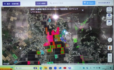 | 意見交換の様子 | ほ場管理システムでのほ場状況 | 稲刈りの様子 (写真提供:(株)エス・ティエフ) |