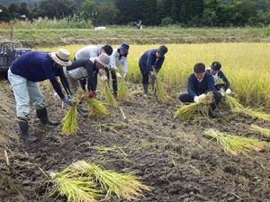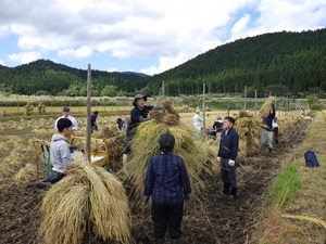 鳴子温泉地域が抱える高齢化に伴う農作業の負担増や担い手不足などによる水稲作付面積の減少といった課題を解決するため、目下の課題である天日干しのくい掛けを私たちが体験し、次の取組へ活かしたいとの考えで企画しました。鳴子温泉地域で「ゆきむすび」を生産しているNPO法人鳴子の米プロジェクト(理事長:上野健夫 氏)の協力をいただき行ったもので、当局の若手職員、大崎市のほか、農業とつながりを持っている企業の東北電力フレンドリー・パートナーズ株式会社、株式会社JTB仙台支店、株式会社タイミーから計15名の参加をいただき、秋晴れのさわやかな気候の中で心地よい汗を流しました。異業種の交流の機会にもなったように思います。