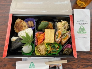 | くい掛け体験に参加した皆さん | お弁当を食べながら意見交換 | 「ゆきむすび」のおにぎりが 3個入ったお弁当 |