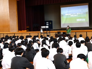 宮城県富谷高等学校普通科では、第1学年の授業において「持続可能な社会を目指すための研究や活動」をテーマに外部講師を招へいした講演会を開催して7年目を迎えます。今年は、基調講演(環境省東北地方環境事務所)と分科会(6組の講師による授業)の2部構成で実施され、昨年に引き続き宮城県拠点が1クラス(41名)を担当しました。