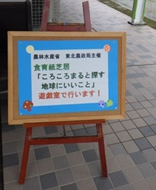 東北農政局では、「みどりの食料システム戦略」の国民の理解醸成のため、将来を担う子どもたち向けに、身近なところから地球にやさしい行動を考えるきっかけ作りとして、紙芝居「ころころまるとさがすちきゅうにいいこと」を使っておはなし会を実施しています。