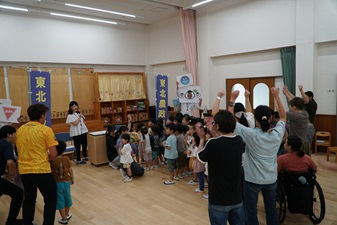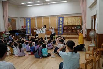 9月8日、名取市にある尚絅学院大学付属幼稚園にて、満3歳児クラスから年長クラスまでの園児52名が「ころころまるとさがすちきゅうにいいこと」おはなし会に参加してくれました。「ころころまる」と「みっちゃん」たちが紹介する、私たちにもできる地球にいいことについて、みんなで「ころころころ」のポーズをしたり、頷きながら楽しくも真剣な眼差しで見てくれました。今回のおはなし会では、アクティビティとして紙芝居の内容に関するクイズも実施し、とても明るく元気に参加してくれました。おはなし会の後も、積極的に食べ物についての話をしていたとのことで、身近なことでも「ちきゅうにいいこと」がたくさんあることに気が付いてくれたのではないかと思います。先生からは、「小さな子どもたちにもできることがあるので、『ちきゅうにいいこと』を考え合う良い経験になったと思います。」とのお言葉をいただきました。ご協力いただきました尚絅学院大学付属幼稚園の皆様、ありがとうございました。