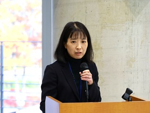 | 宮城県富谷高等学校の外観 | 基調講演の様子 環境省東北地方環境事務所 国立公園課地域生物多様性増進室 相澤あゆみ自然環境調整専門官 |