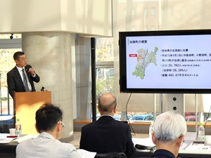 令和7年12月5日に開催された令和7年度土地改良区役員研修会にて、宮城県拠点長田地方参事官が「コメ政策に関する情報提供」をテーマに説明を行いました。今回の研修会には約120名が参加しており、長田地方参事官から、新たな食料・農業・農村基本計画のポイントや、今般の米価高騰の要因、支援策等についての情報提供を行いました。質疑応答の時間には、参加者から様々な質問やご意見を頂きました。宮城県拠点では、研修会や勉強会への講師派遣を随時行っております。