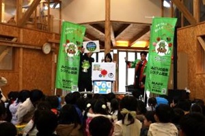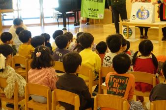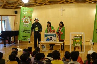 今年度最後、4回目の開催となる「ころころまるとさがすちきゅうにいいこと」おはなし会は、向山こども園にて、年少から年長クラスの園児約80名が参加してくれました。紙芝居に登場する、東北農政局独自キャラクターの「みっちゃん」を紹介すると、みんな大きな声で「みっちゃ~ん」と呼んでくれ、キラキラとした眼差しで、紙芝居を見てくれました。「カブの葉っぱは食べられる」と、紙芝居で紹介すると、「知ってるよ~」と元気よく教えてくれました。とても楽しみに待っていてくれた、紙芝居の後のクイズも積極的に参加してくれ、「ちきゅうにいいこと」は、毎日の生活の中にたくさんあることに気づくきっかけのひとつとなっていたら幸いです。