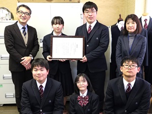 | 記念撮影 右から 長田地方参事官 松島高校パソコン部の皆さん 中澤輝博校長 |