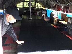 | 選別作業場の様子 黄ばんだ葉やゴミを見つけやすいように黒い台の上でセリを選別します。 |